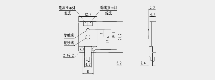 GN-045機(jī)身是21.2*12.7毫米的大小,有兩個(gè)指示燈,分別是電源指示燈紅色,上電就亮,還有一個(gè)輸出指示燈綠色。產(chǎn)品有兩個(gè)光孔,一個(gè)發(fā)射,一個(gè)接收,另有直徑2.2毫米的螺絲安裝孔,以固定位置。