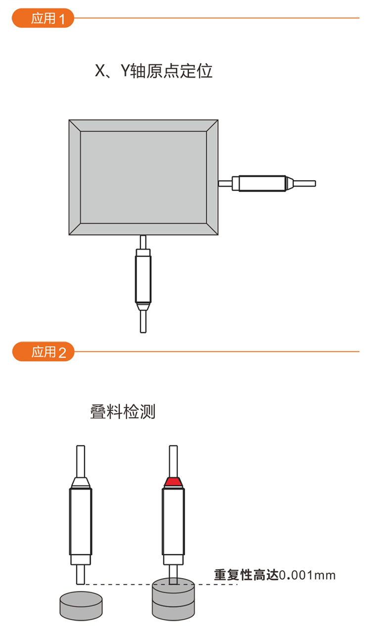 如X\Y軸定位,在物體運動的X/Y軸上安裝該傳感器,當物體朝軸方向運動,按壓到傳感器后在觸發(fā)信號的位置輸出信號,再控制物體停止或做其他動作。